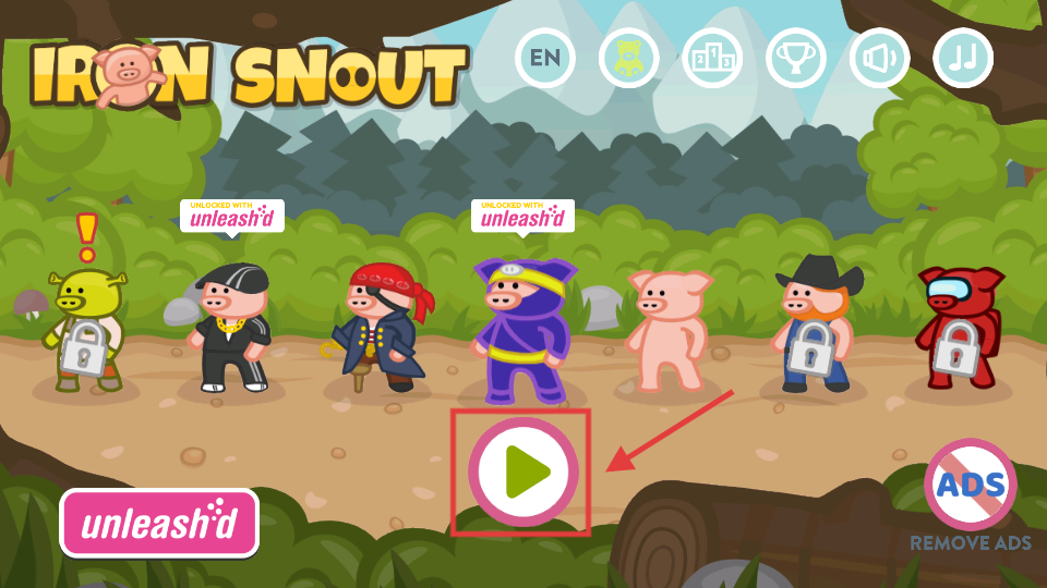 1、选择【紫色忍者猪】角色,点击【绿色三角形】按钮,即可进入关卡开启战斗。