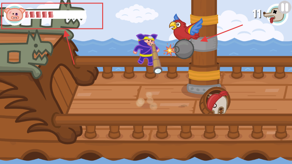3、关注左上角【培根】生命值,用火炮攻击时,避开鹦鹉投放的炸弹或反击。