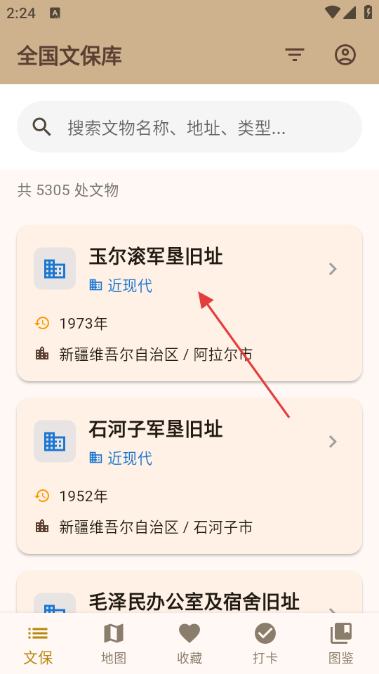 2、在主界面中,点击【玉尔滚军垦旧址】条目,进入该文物的详情页面。