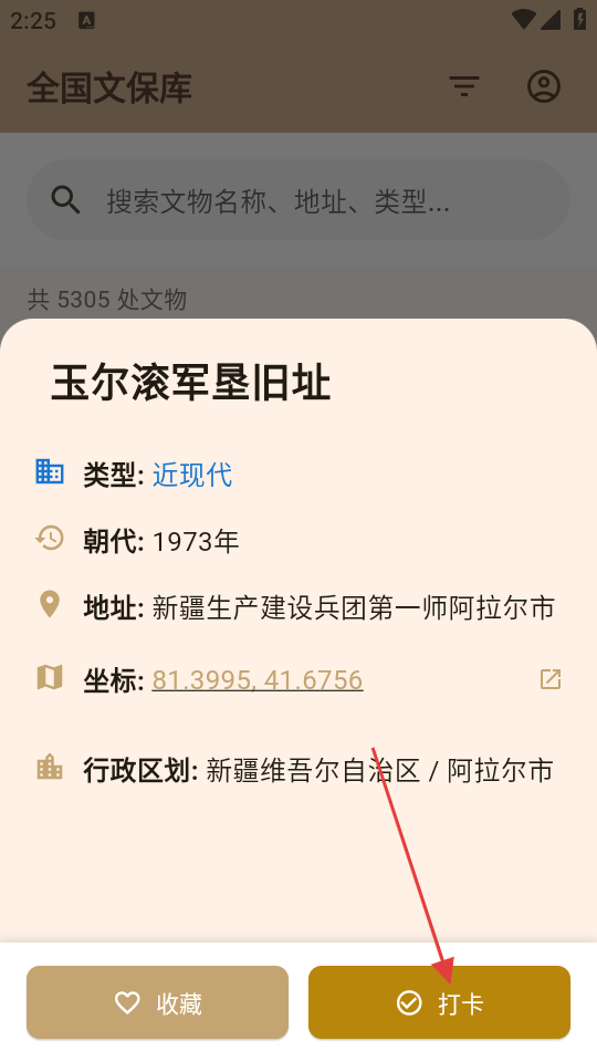 3、在文物详情页面里,点击【打卡】按钮,进入打卡页面。