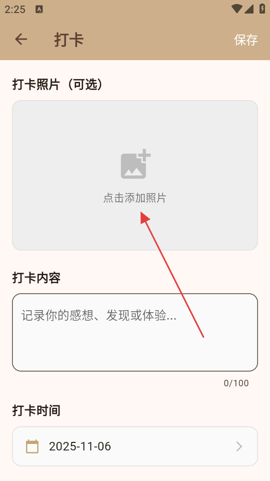 4、在打卡页面中,可点击添加照片、输入打卡内容,完成后点击【保存】按钮即可完成打卡。