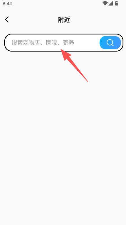 1、进入附近板块,在搜索栏输入宠物店、医院、寄养,查找周边宠物服务点。