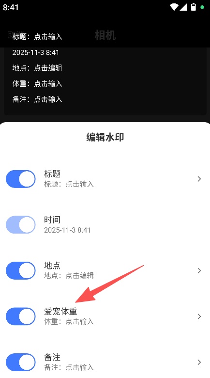 3、在编辑水印中,开启爱宠体重等选项,输入信息后完成宠物记录。