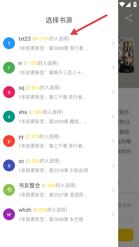 4、在选择书源页面,点击【txt23】书源,开始阅读《狂少归来》。