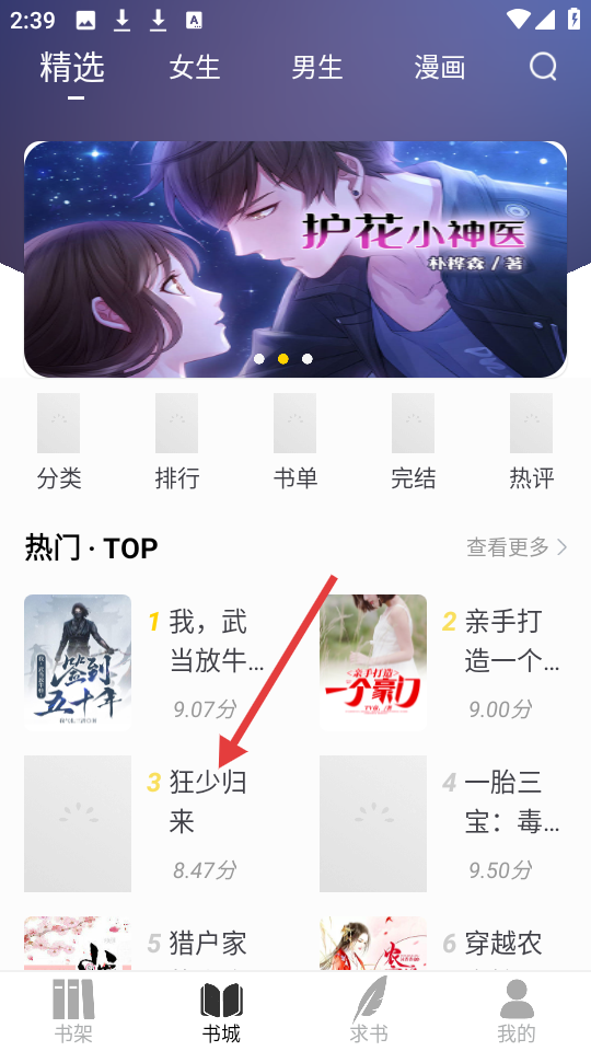 2、在书城热门・TOP区域,点击【狂少归来】条目,进入该书详情页。