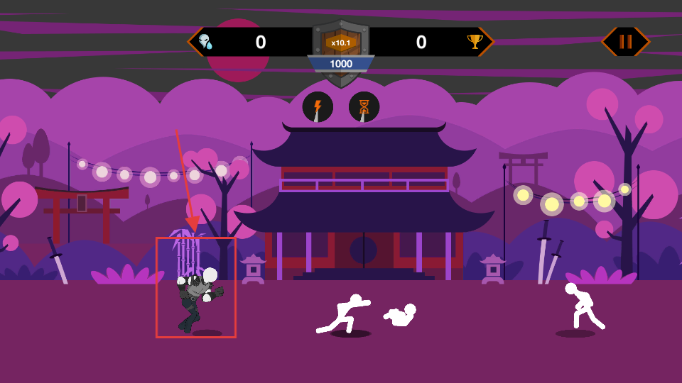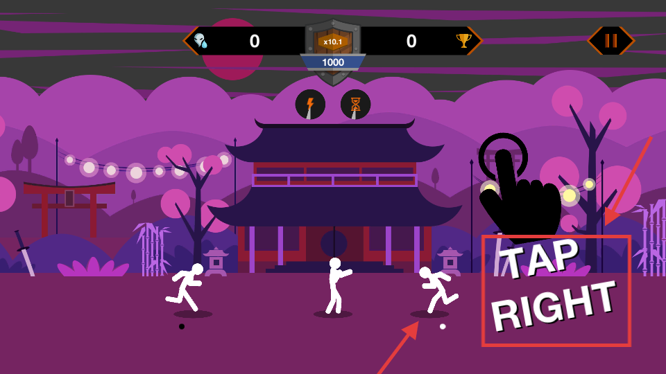 2、战斗时按提示点击【TAP-RIGHT】区域,操控角色右向攻击,应对来袭的白色火柴人敌人。