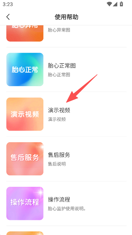 1、进入使用帮助,点击演示视频,查看胎心监护相关演示内容。