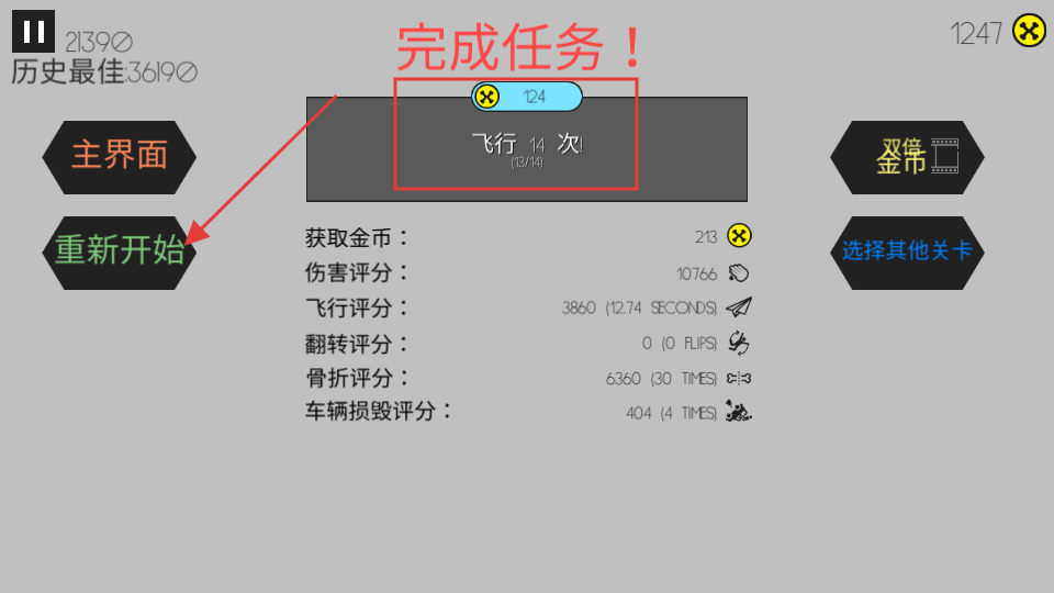 4、完成任务后可查看飞行次数、金币获取等数据,点击“重新开始”可再次挑战,积累经验以突破历史最佳成绩。