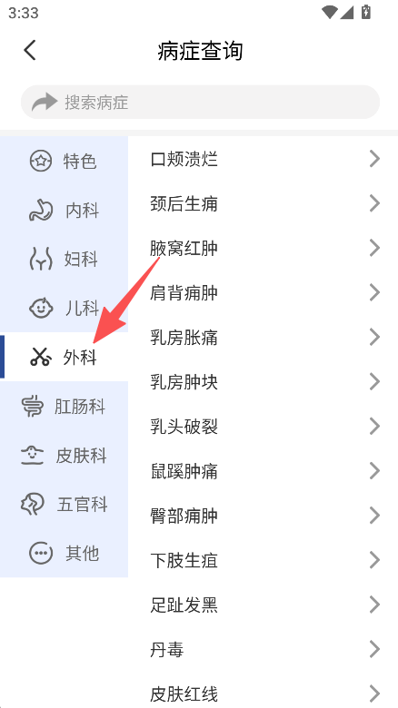 1、进入病症查询,在搜索栏输入病症或选择科室(如外科)。