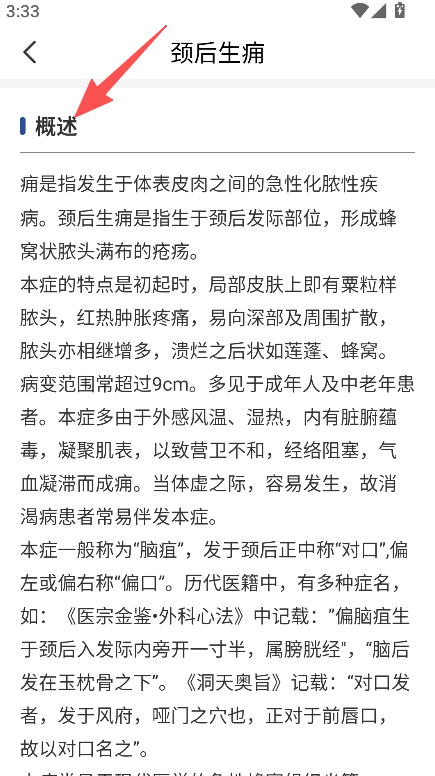2、支持病症详细概述查看功能,点击具体病症(如颈后生痈)即可查看其特点、成因、历史称谓等详细信息,助力深入了解病症。
