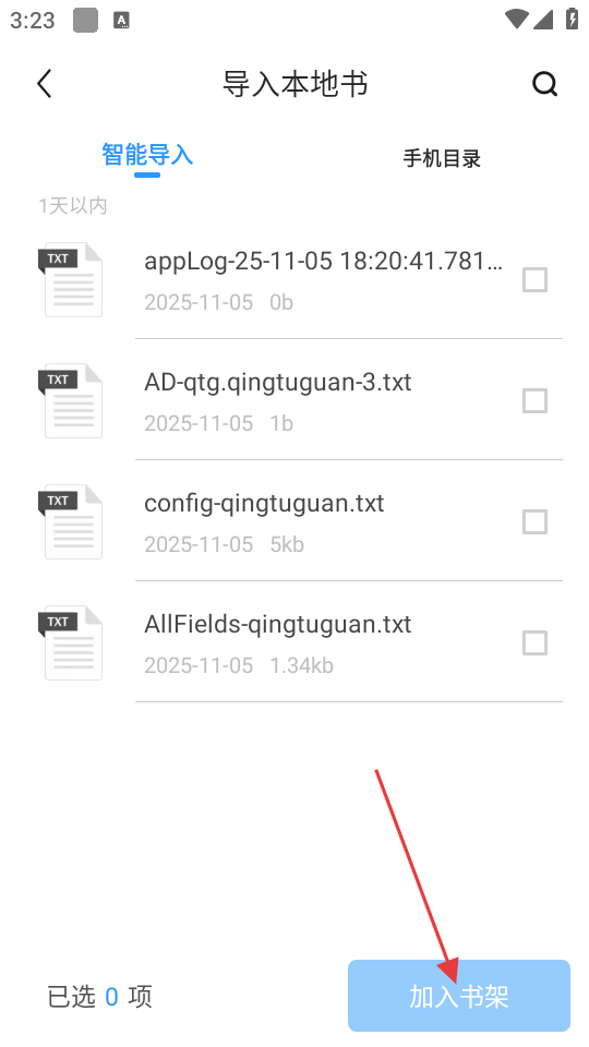 4、在导入本地书页面中,选择要导入的本地书籍后,点击【加入书架】按钮,完成书籍导入。