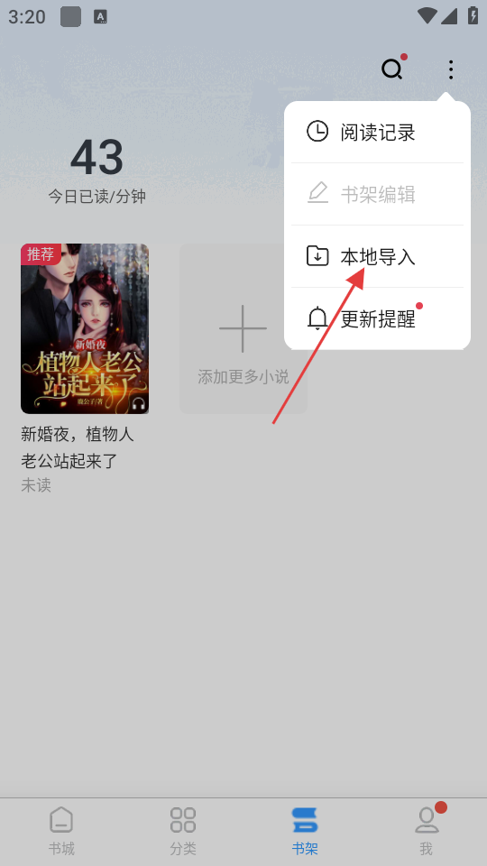 3、在功能菜单里,点击【本地导入】选项,进入导入本地书页面。