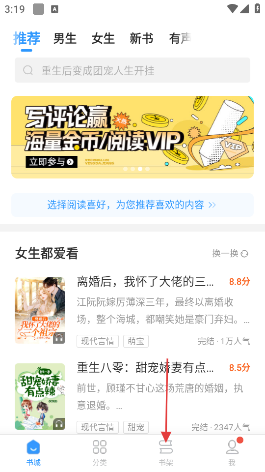1、在书城界面,点击底部的【书架】按钮,进入书架页面。