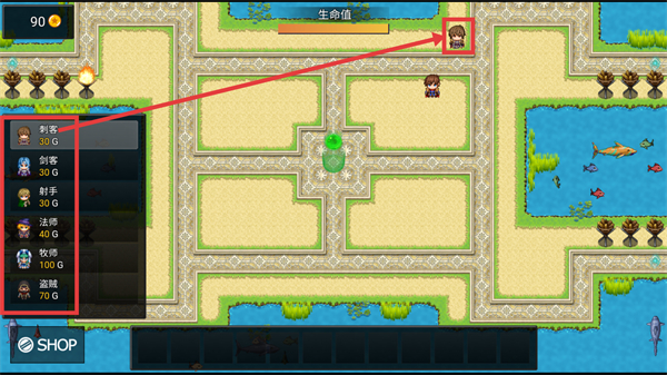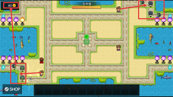 3、战斗时关注【金币-40】,利用已布置角色消灭敌人,获取金币并守护生命值,防止敌人突破。