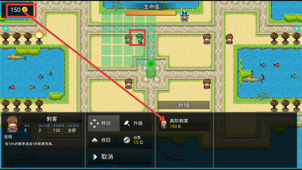 4、当金币积累到【150】时,将刺客升级为【高阶刺客-100G】,提升角色战力,强化防御效果。