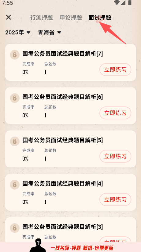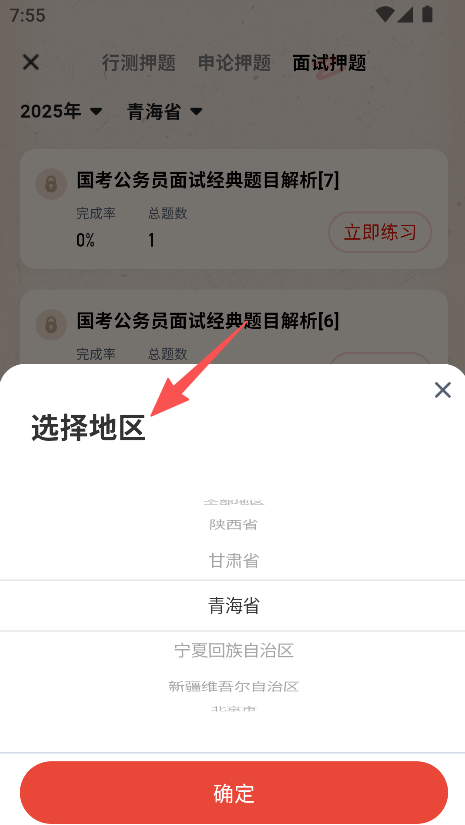 2、选择面试押题,进入地区选择,选定目标地区(如青海省)。