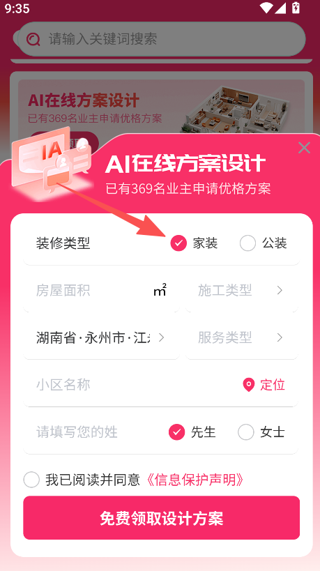 2、选择装修类型(家装或公装),填写房屋面积、地区等信息。