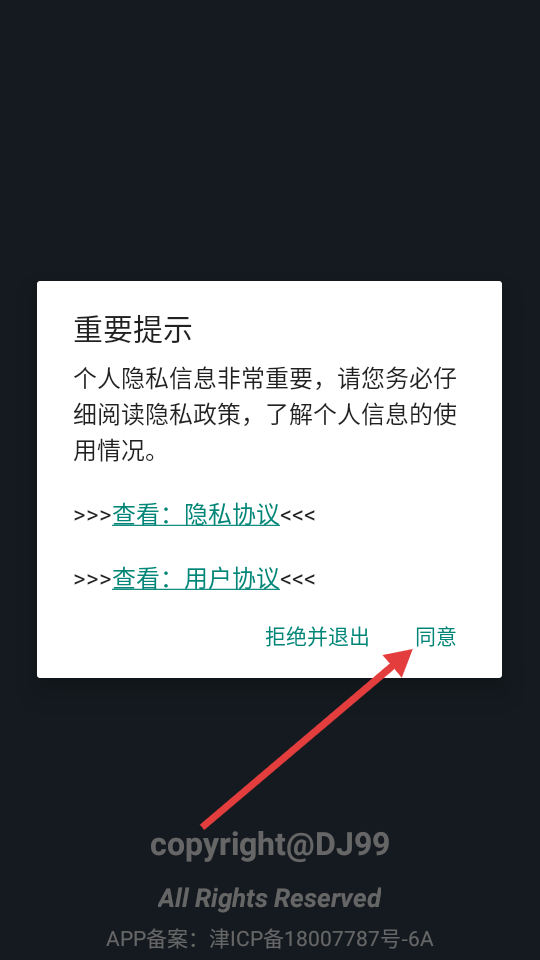 1、在重要提示弹窗中,点击【同意】按钮,开启APP服务。