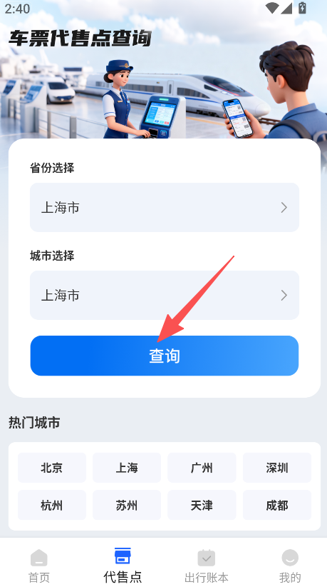 1、具备省份选择功能,用户可选择目标省份(如上海市),为代售点查询划定区域范围,开启查询流程。