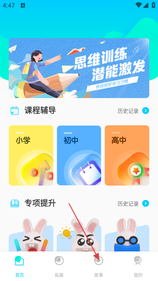 1、在应用首页,点击底部的【故事】按钮,进入故事页面。