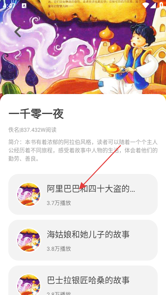 3、在《一千零一夜》详情页面里,点击《阿里巴巴和四十大盗的故事》条目,进入该故事的阅读页面。