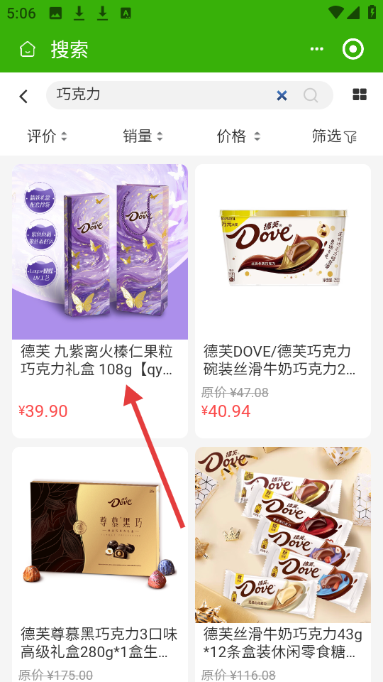 3、点击搜索结果中的【德芙九紫离火榛仁果粒巧克力礼盒108g】商品条目,进入商品详情页。
