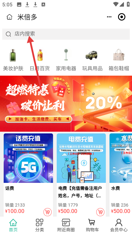 1、点击页面顶部的【店内搜索】框,进入搜索页面。