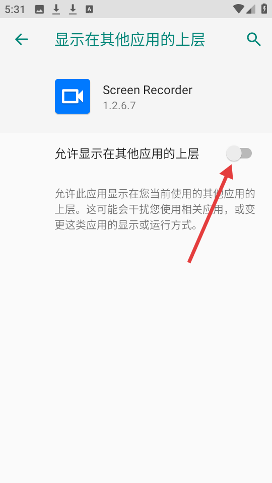 3、进入“显示在其他应用的上层”设置界面,开启开关,以便应用能在其他应用上层显示录制控件。
