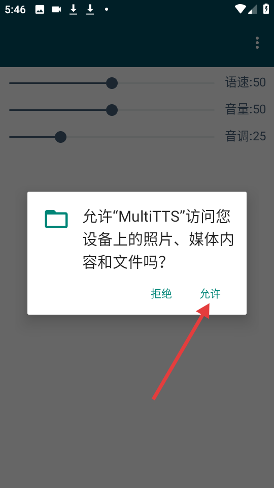 1、当“MultiTTS”请求访问设备上的照片、媒体内容和文件时,点击“允许”,以获取相应权限。