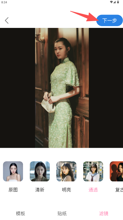 2、在编辑界面底部选择滤镜效果,点击右侧“下一步”确认应用。