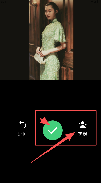 3、进入美颜功能页后调整参数,点击对勾图标完成美化并保存照片。