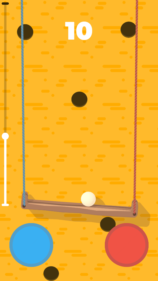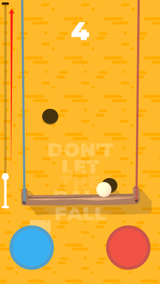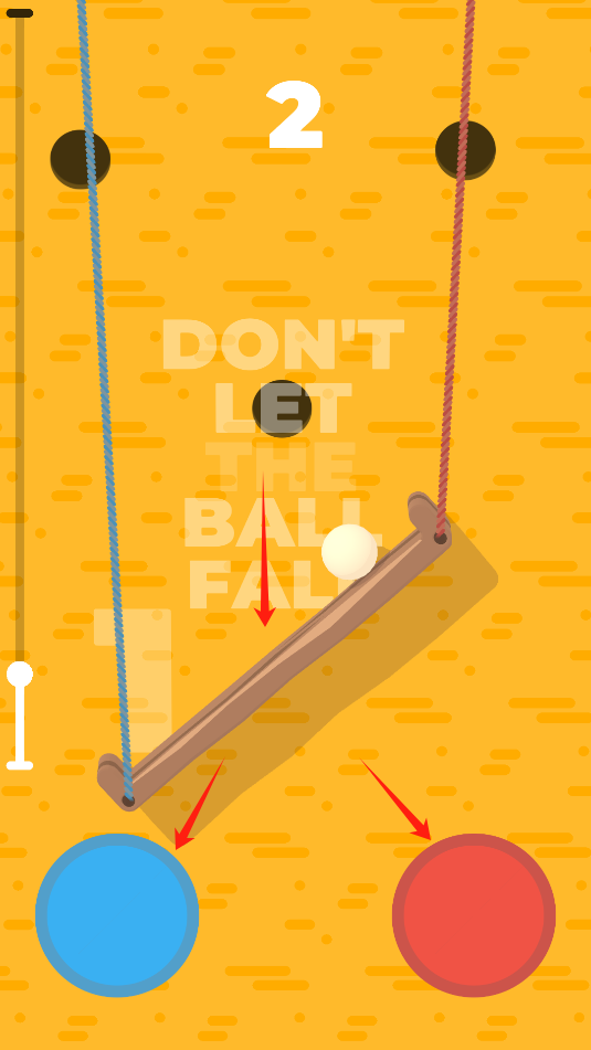 1、游戏中,点击左右两边的蓝红按钮,拉绳子,让小球保持在木板上。