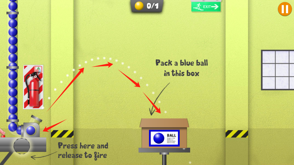 3、游戏中,按住滑动左下角的枪头,先根据白色虚线瞄准箱子里,松开手指即可让小球发射进箱子。
