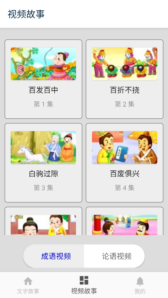 3、点击视频故事,可以选择一个成语进入观看,软件会以动画片方式播放。