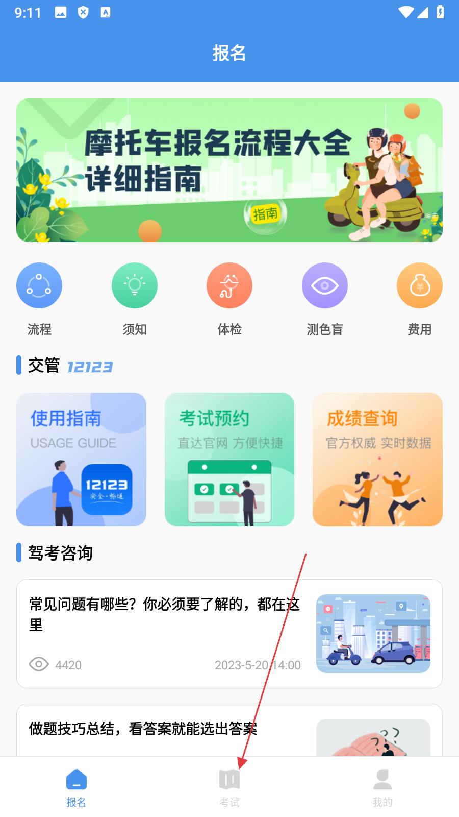 1、点击底部【考试】,进入摩托车驾驶证考试宝典页面。