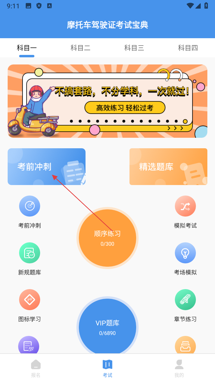 2、在考试页面,点击【考前冲刺】,进入考前冲刺答题页面。