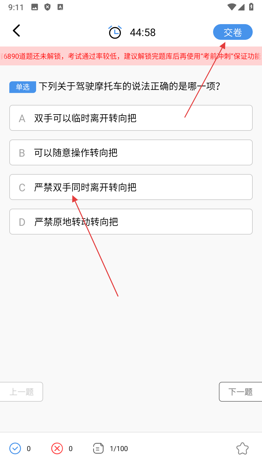 3、在答题页面【选择正确答案】后,点击【交卷】,提交考试答案。