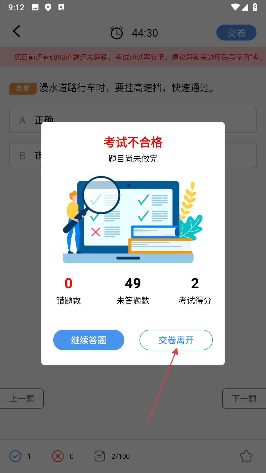 4、提交后根据提示,点击【交卷离开】,即可完成考试操作。