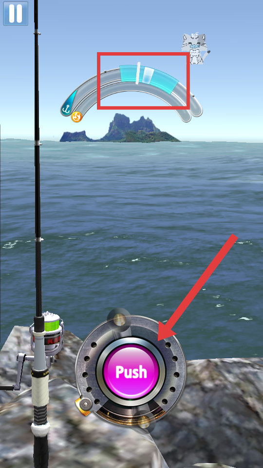 2、当鱼上钩后,观察上方的能量条,适时点击【Push】按钮,控制鱼竿的拉力,与鱼进行博弈。