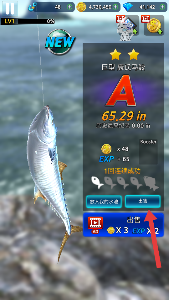 4、成功钓上鱼后,可选择将鱼放入水池或出售获取金币和经验,提升等级和钓鱼能力,解锁更多钓鱼区域和装备。
