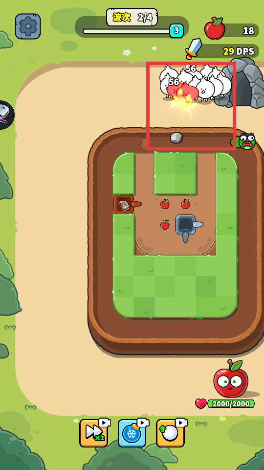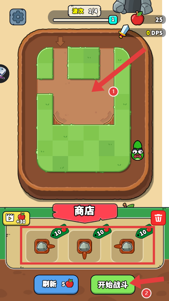 2、在地图上布置防御设施,消耗苹果资源购买并放置后,点击【开始战斗】,抵御敌人的进攻。