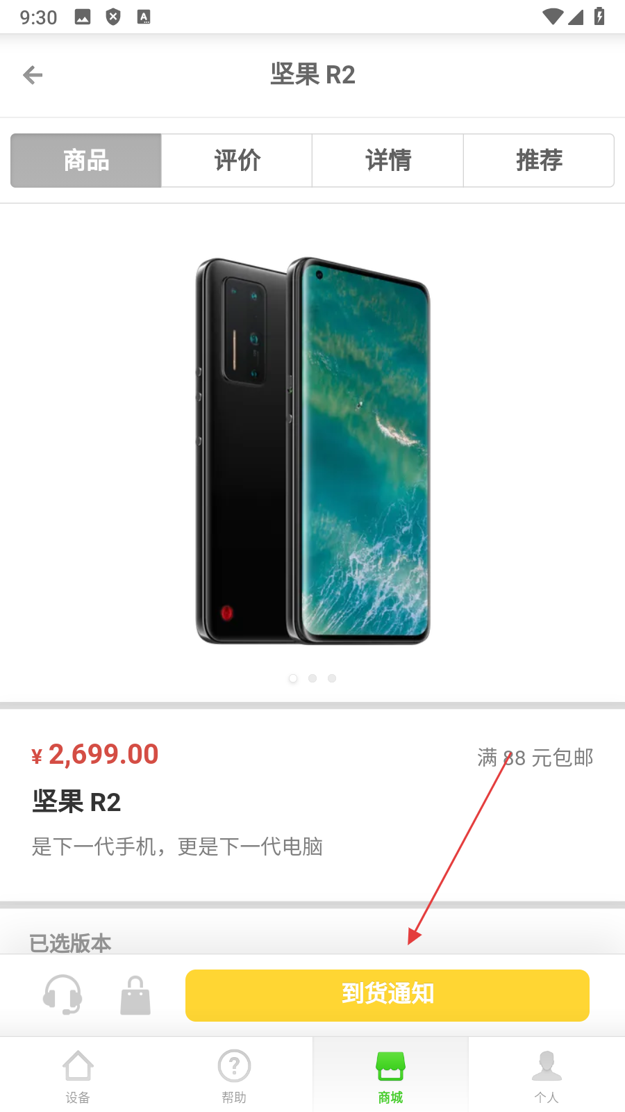 4、在商品详情页面,点击【到货通知】,即可完成购买操作。