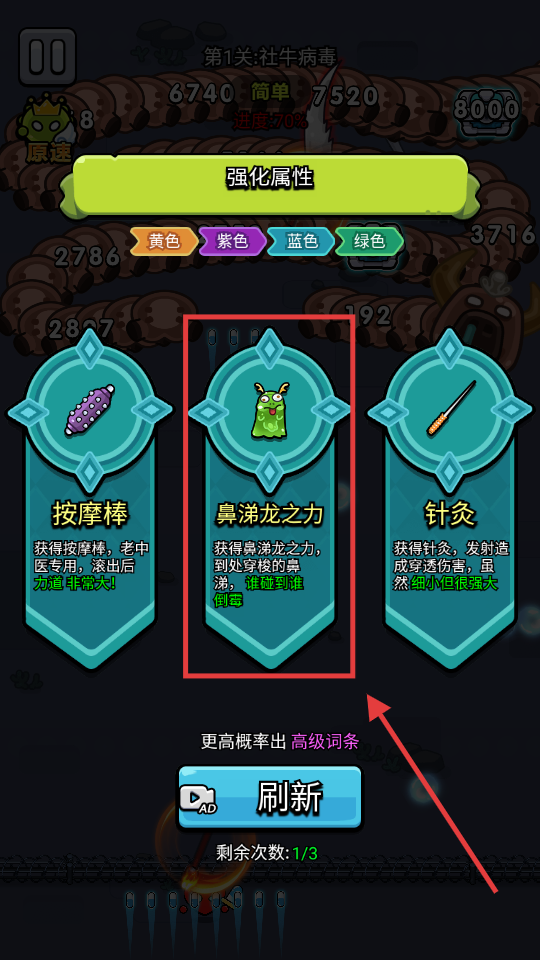 1、选择【鼻涕龙之力】,其穿梭的鼻涕碰到敌人会使其倒霉,可有效清理周围病毒。