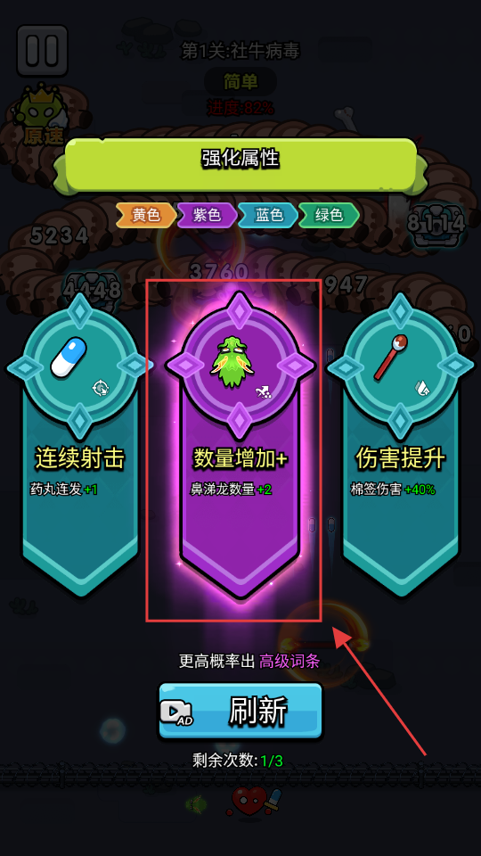 3、强化时选【数量增加+】,使鼻涕龙数量加2,提升攻击频率和范围,增强清场能力。