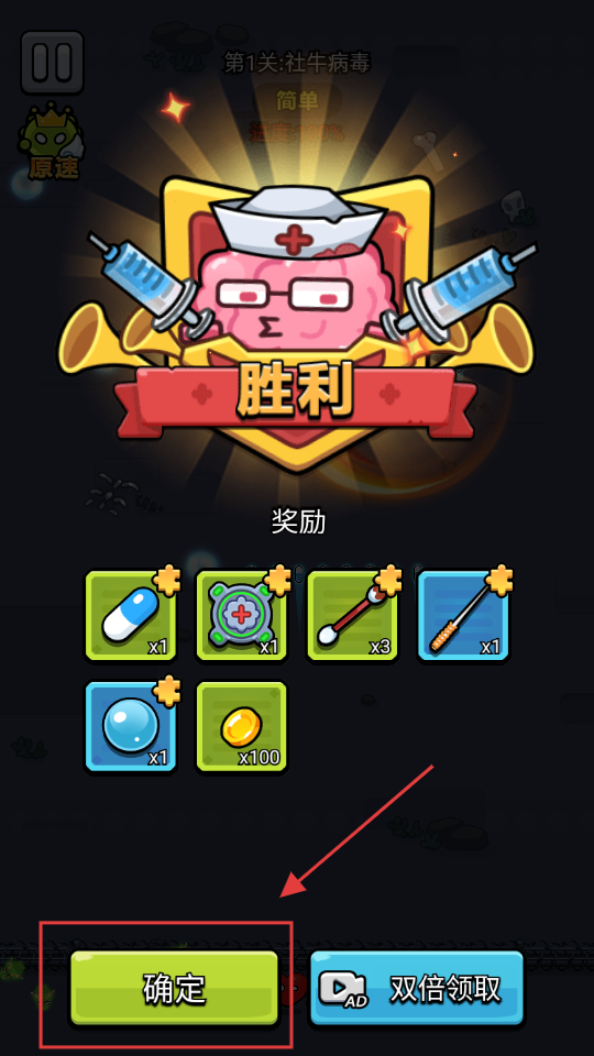 4、关卡胜利后,点击【确定】领取奖励,获取的道具可用于强化角色,提升后续战斗能力。