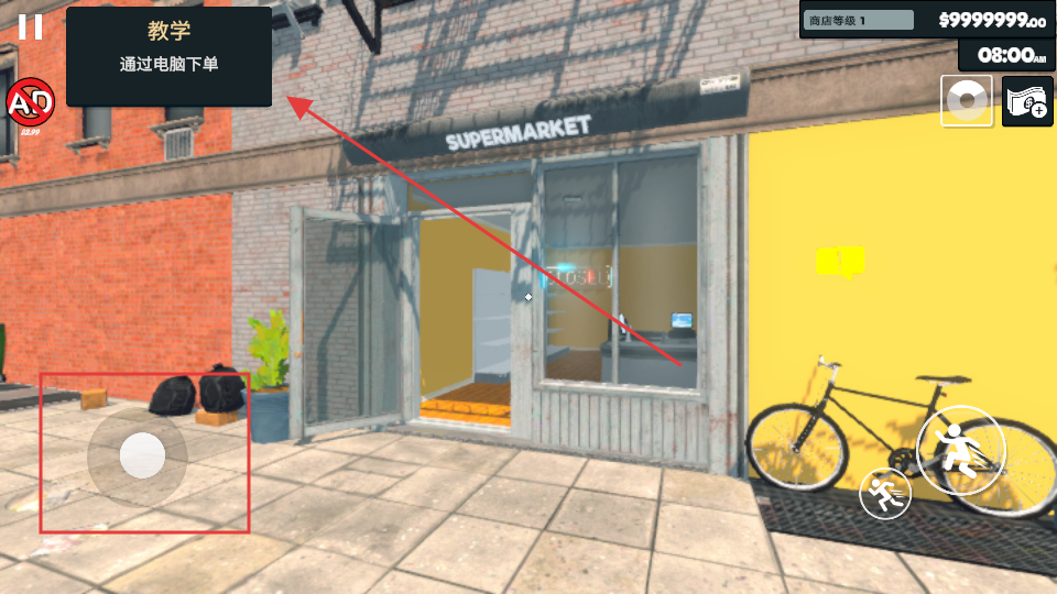 2、根据“通过电脑下单”的教学提示,利用左侧虚拟摇杆控制角色移动,进入超市内部找到电脑,准备进行商品采购操作。