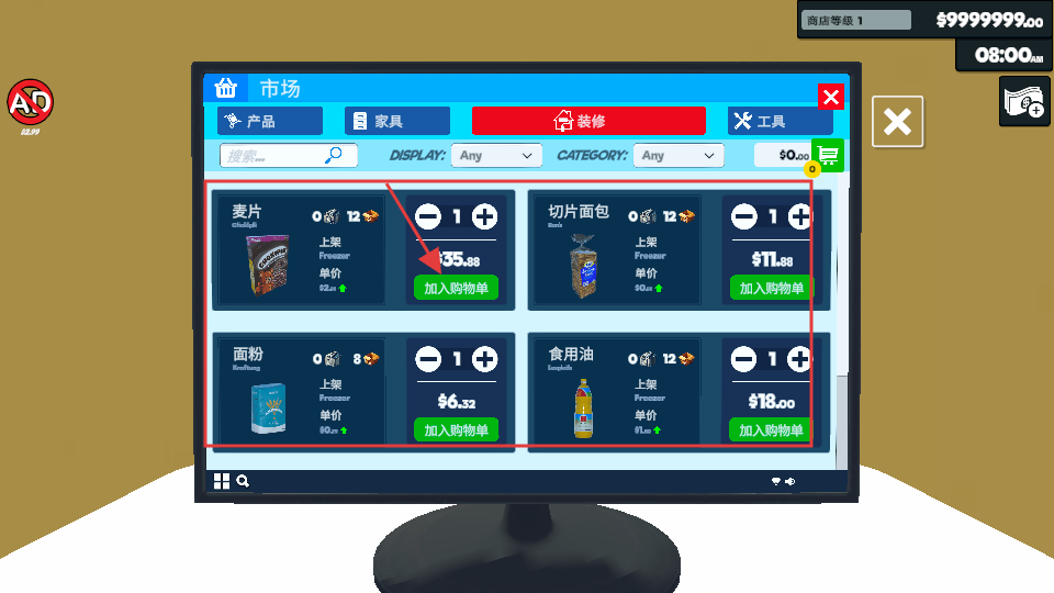 4、在市场界面中,根据超市的经营需求,合理选择商品加入购物单,完成采购后为超市备货。