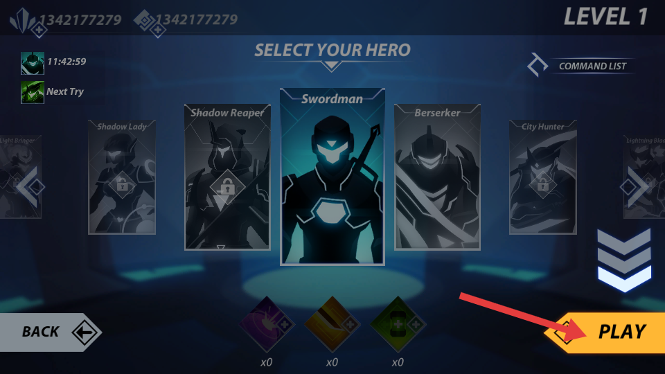 2、选择英雄【Swordman】,点击【PLAY】按钮,进入游戏战斗。
