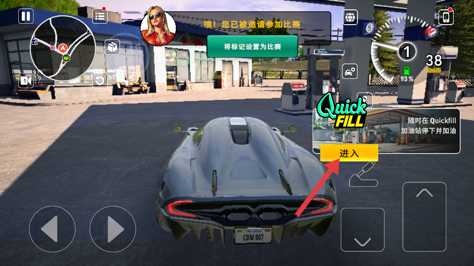 3、在加油站点击【进入】,完成加油操作,保障车辆行驶。