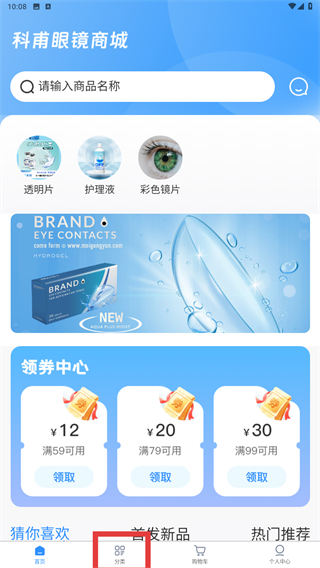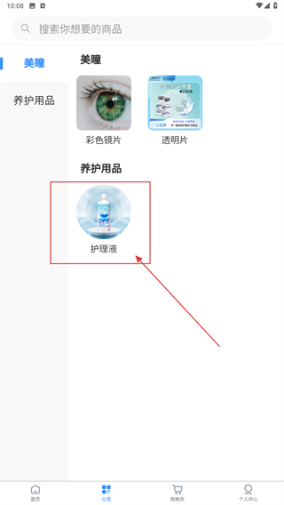 1、点击底部【分类】按钮,可进入商品分类页,查看【美瞳】-【养护用品】等分类,方便选品。